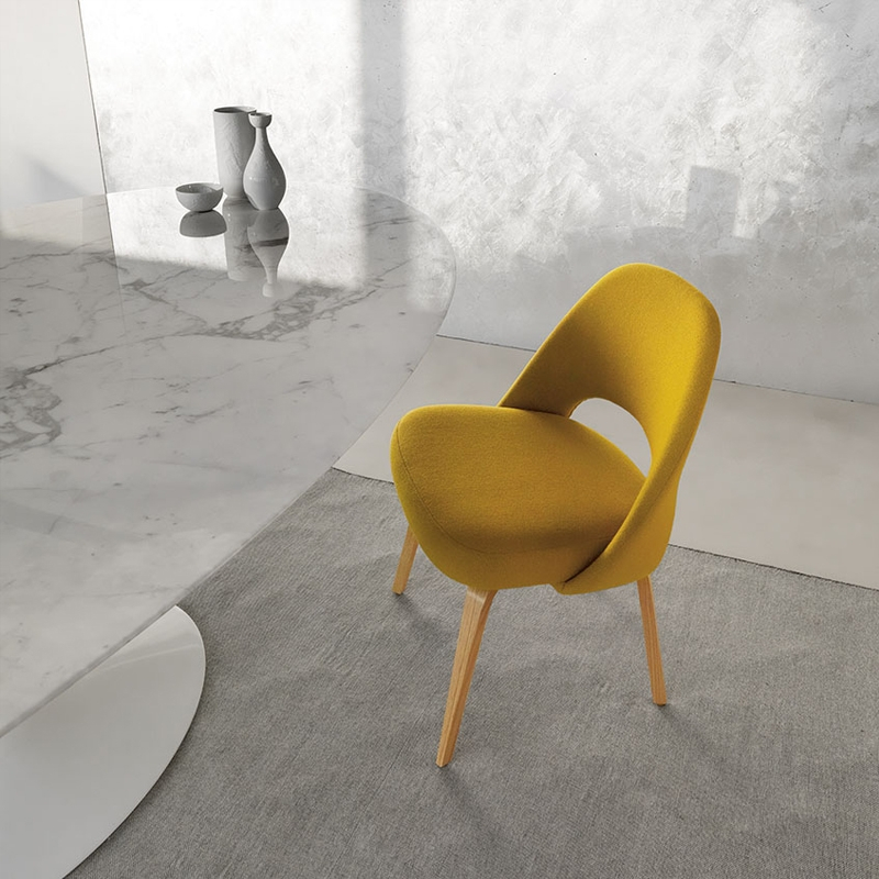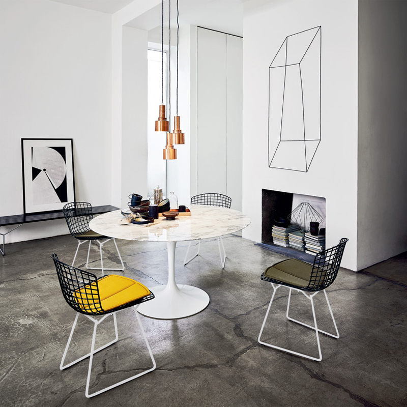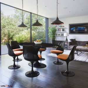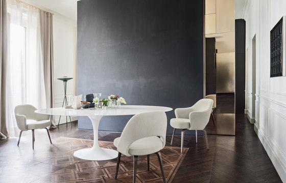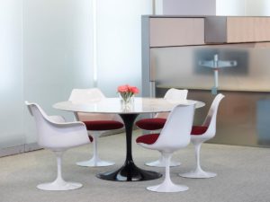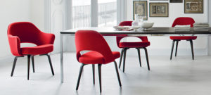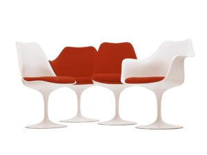 En parallèle de son travail d’architecte, Saarinen s’est également illustré en tant que designer, créant des pièces remarquables telles que la chaise Organic Chair, co-conçue avec Charles Eames pour Vitra, et la collection Tulip pour Knoll, comprenant la célèbre chaise Tulip Chair et les tables et Gueridon Tulip Table. Sa collaboration avec Knoll a également donné naissance à la collection de fauteuils Womb, dessinée avec Florence Knoll.