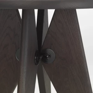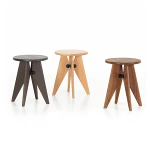 Chaque création édité par Vitra témoigne de l’approche ingénieuse de Prouvé : la chaise Standard (1934), par exemple, présente une structure où les pieds antérieurs sont en tubulaire d’acier tandis que les pieds postérieurs sont en tôles presse-pliées, assurant ainsi un meilleur support du poids. Le Tabouret Solvay (1941) met en valeur les éléments structurels et portants, avec quatre pieds visibles soutenus par un élément central en acier. Quant à la lampe Potence (1950), elle offre une forme simple et essentielle, conçue spécialement pour la « Maison Tropicale« , un prototype de bâtiment préfabriqué destiné aux colonies françaises.