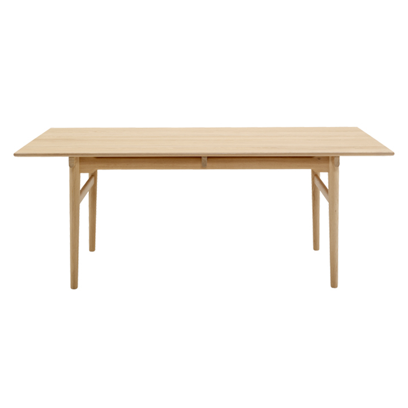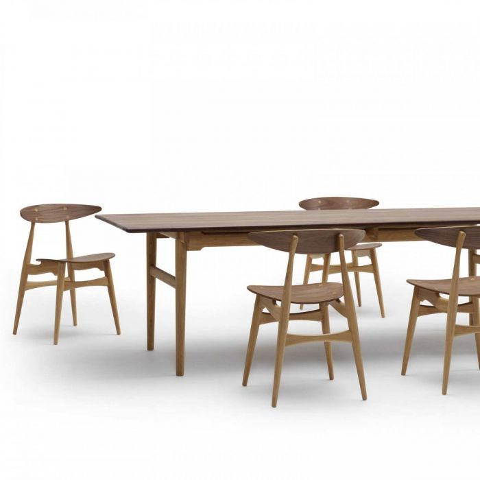 La table CH327, conçue par Hans J. Wegner en 1962 et fabriquée par la marque Carl Hansen & Søn, incarne la fusion réussie entre créativité et savoir-faire. Faite de bois massif, elle se distingue par ses lignes épurées, ses pieds arrondis et son plateau semblant flotter grâce à des rails discrets. Extensible grâce à des rallonges, elle s’adapte aisément aux besoins, pouvant accueillir de 6 à 10 personnes. Polyvalente, la table CH327 de Carl Hansen & Søn sert aussi bien de table à manger que de table de réunion ou de bureau, offrant un design intemporel et une fonctionnalité remarquable, ce qui en fait l’une des icônes du mobilier scandinave .