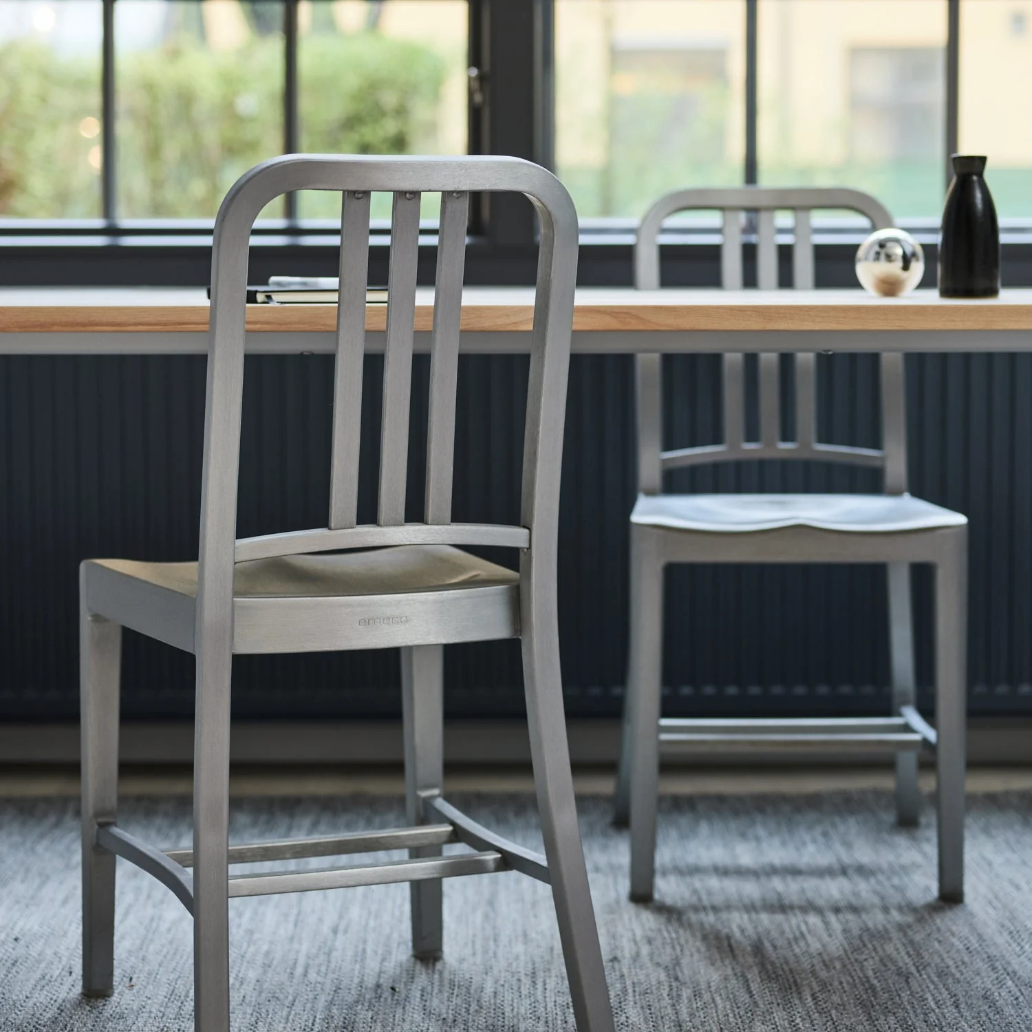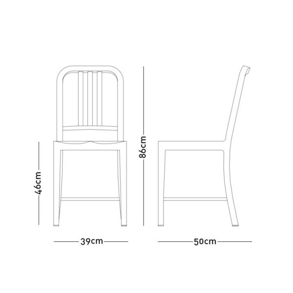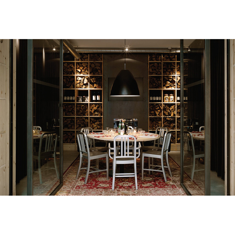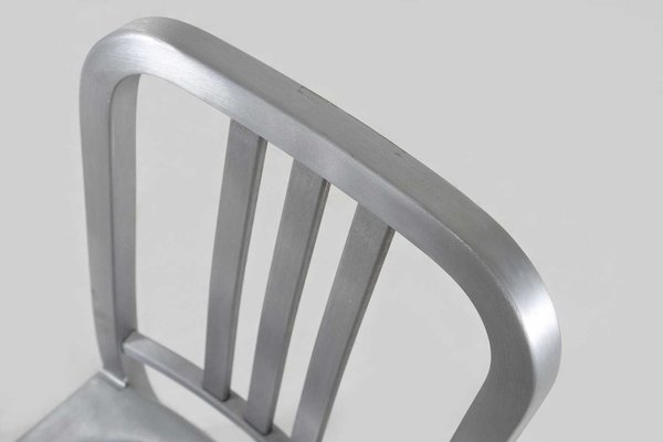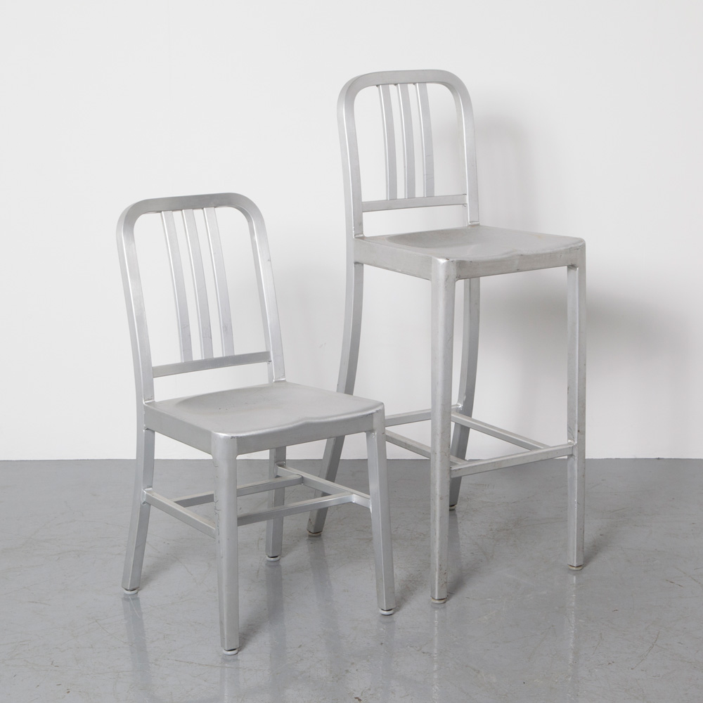 Initialement conçue pour les sous-marins de l’armée américaine en 1944, la chaise Navy 1006 est fabriquée sans interruption depuis. Les ouvriers d’Emeco suivent un procédé en 77 étapes pour transformer à la main l’aluminium recyclé, le façonner, le souder et le renforcer par des bains salins. La chaise est ensuite anodisée pour une finition durable. Le résultat est une chaise légère, ultra-résistante, ignifuge et non corrosive, adaptée à un usage intérieur ou extérieur. Emblématique et polyvalente, la chaise Navy enrichit tout espace de son caractère distinctif et est devenue une icône du design. Emeco garantit la 1006 Navy à vie.