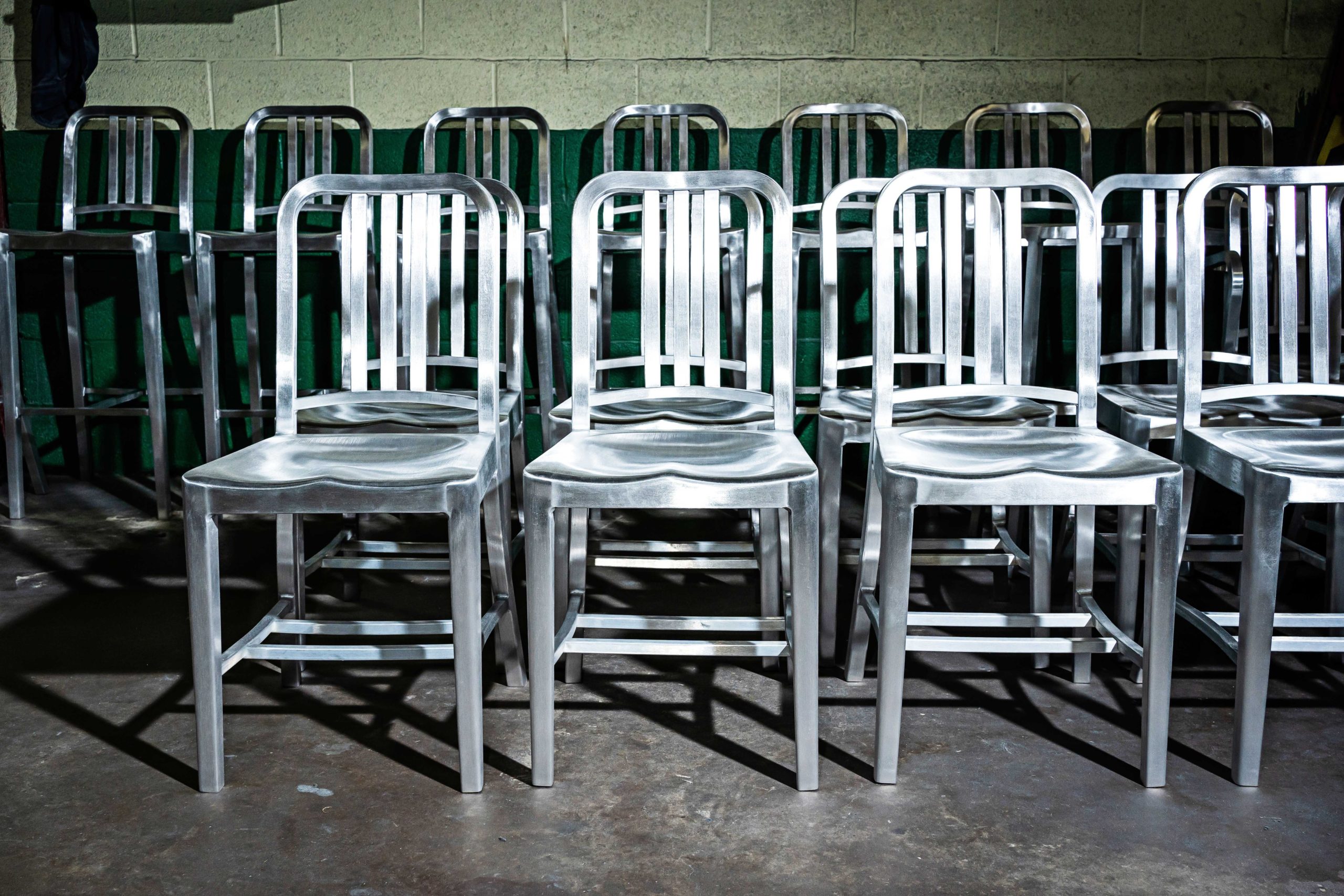 Le processus de fabrication chez Emeco est un mélange d’artisanat traditionnel et de technologies modernes. Les chaises sont façonnées à la main, polies et anodisées pour garantir une durabilité exceptionnelle et une finition de haute qualité. Chaque produit passe par plusieurs étapes de contrôle de qualité pour assurer sa robustesse et sa longévité.