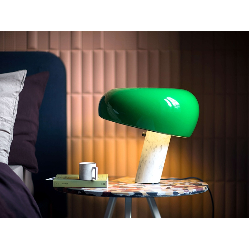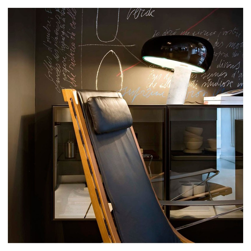La lampe de table Snoopy, conçue en 1967 par les frères Achille et Pier Giacomo Castiglioni, est une œuvre emblématique. Son design reprend la silhouette reconnaissable de Snoopy, le personnage de bande dessinée. Reposant sur un pied en marbre blanc, elle est coiffée d’un abat-jour en métal émaillé, disponible dans des coloris tels que le vert, l’orange ou le noir. Cette création illustre une fois de plus le talent exceptionnel des frères Castiglioni dans le domaine du design luminaire.
