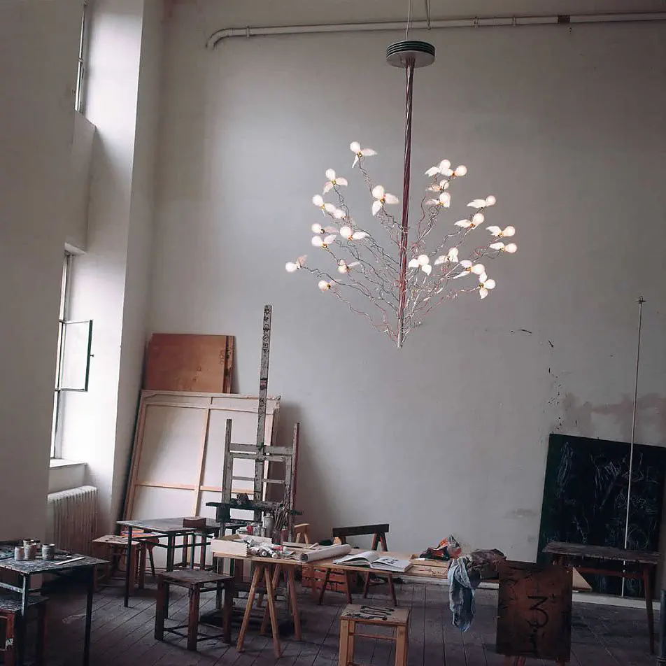 Lucellino, une création emblématique d’Ingo Maurer datant de 1992, est aujourd’hui une lampe a poser culte. Composée de laiton, de plastique et de plumes, elle met en valeur l’ampoule nue, délicatement ornée de plumes, offrant ainsi un objet à la fois fonctionnel et poétique. Ingo Maurer joue avec les mots en associant « luce » (lumière en italien) et « uccellino » (petit oiseau), ajoutant une touche de charme à cette création. Cette lampe semble presque en lévitation, perchée sur deux fils électriques qui servent également de structure. Livrée avec une ampoule de rechange, Lucellino est également disponible en version applique murale, suspension et plafonnier, ajoutant ainsi à son aura d’icône du design contemporain.