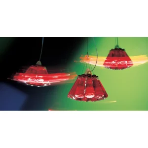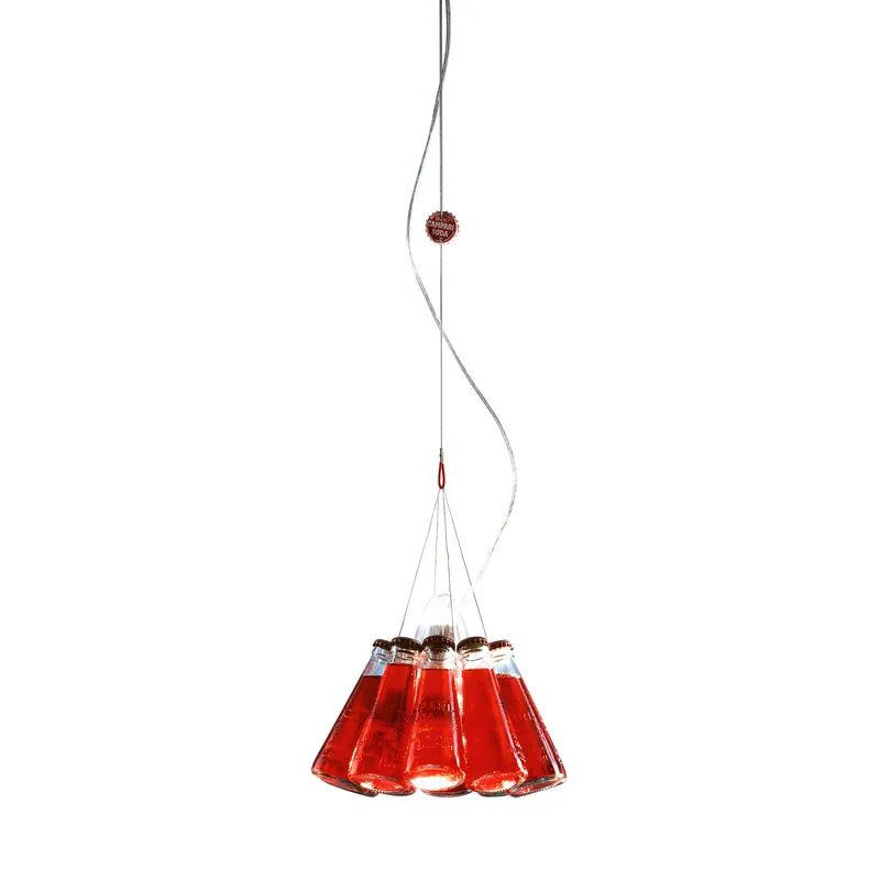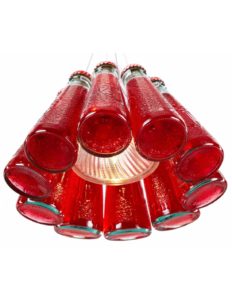 Créée en 2002 par Raphaelle Celentano pour Ingo Maurer, la suspension Campari Light est devenue une icône du design. Inspirée par les œuvres d’Andy Warhol, elle utilise dix bouteilles authentiques de Campari soda pour diffuser une lumière rouge distinctive. La hauteur du câble, réglable grâce à une capsule Campari, peut atteindre jusqu’à 300 cm, ou 550 cm pour les grands plafonds. Fabriquée en Europe, cette lampe allie esthétique et humour, apportant une touche unique et iconique à tout intérieur.