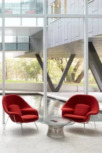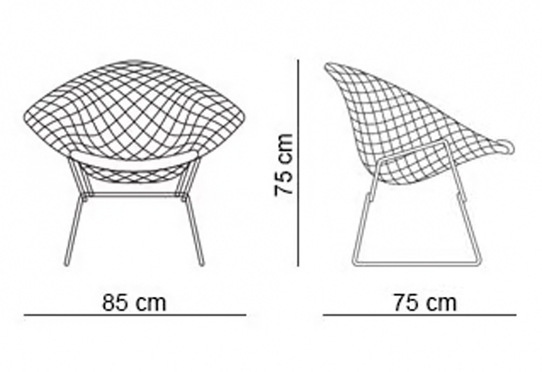 Harry Bertoia, en 1952, révolutionne le monde du design en explorant le pliage de tiges de métal pour créer des sculptures à la fois esthétiques et fonctionnelles. Cette expérimentation donne naissance à une collection de sièges qui ont traversé six décennies sans perdre de leur éclat. Le fauteuil Diamond de Knoll, avec son esthétique à la fois classique et contemporaine, associe élégance et légèreté, s’intégrant harmonieusement à divers environnements. Reconnu comme l’un des icônes du design, ce fauteuil de Harry Bertoia incarne parfaitement l’élégance intemporelle et la fonctionnalité.. Sa base et son assise sont constituées de tiges de métal chromé soigneusement soudées. L’assise est agrémentée d’un coussin amovible disponible en tissu Tonus rouge ou en vinyle blanc. Le logo emblématique de Knoll est gravé sur le piètement du fauteuil , ajoutant une touche distinctive à cette pièce intemporelle du design.