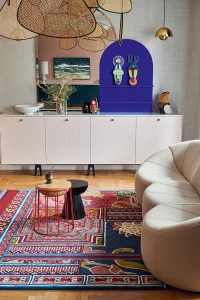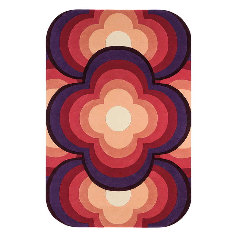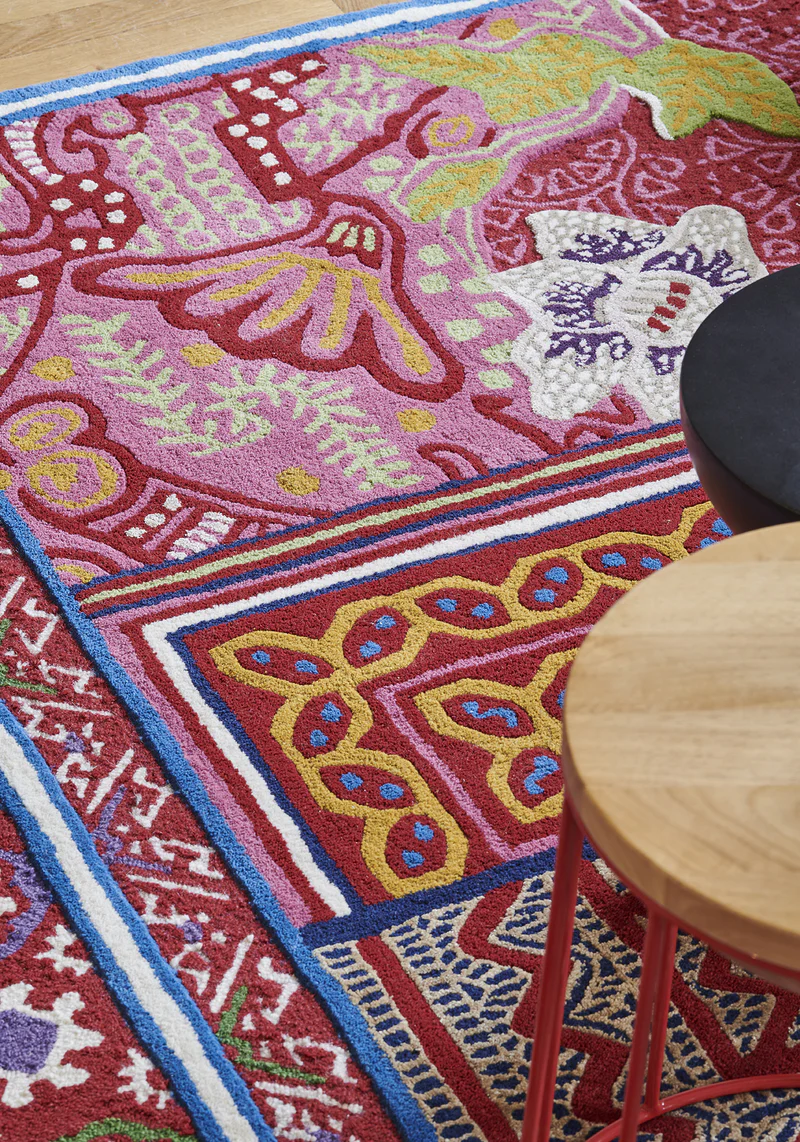 Le tapis rose en laine tufté à la main par Géraldine Prieur, architecte d’intérieur renommée, est la dernière création de la célèbre designer. Inspiré par la culture pop des années 70, ce tapis Flower Power joue habilement avec des variations de niveaux et des motifs floraux stylisés. Fabriqué en laine de Nouvelle-Zélande mélangée, il peut être personnalisé en taille et couleurs. Son entretien est simple, nécessitant un aspirateur sans brosse et un nettoyage en profondeur tous les quatre ans environ. Une collaboration avec Tout le Monde Bochart, cette pièce incarne l’excellence du design contemporain et demeure une des icônes de la collection.
