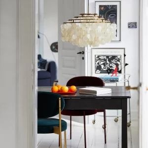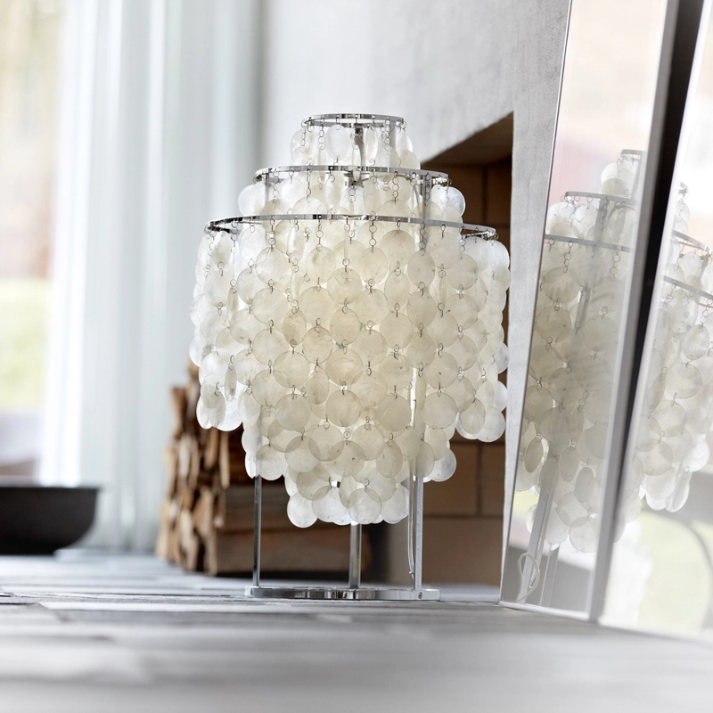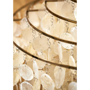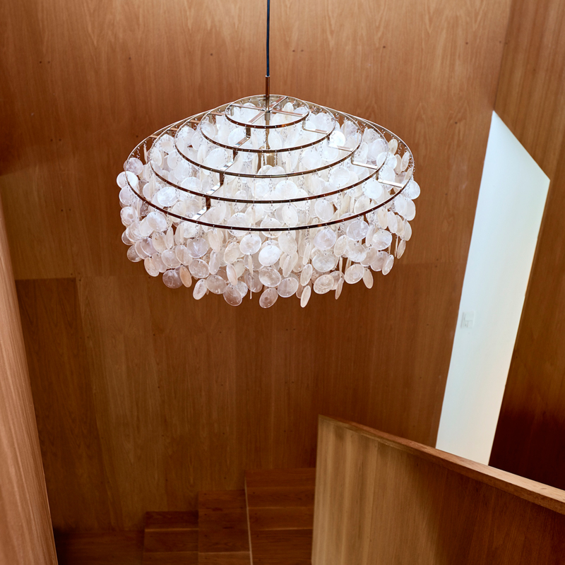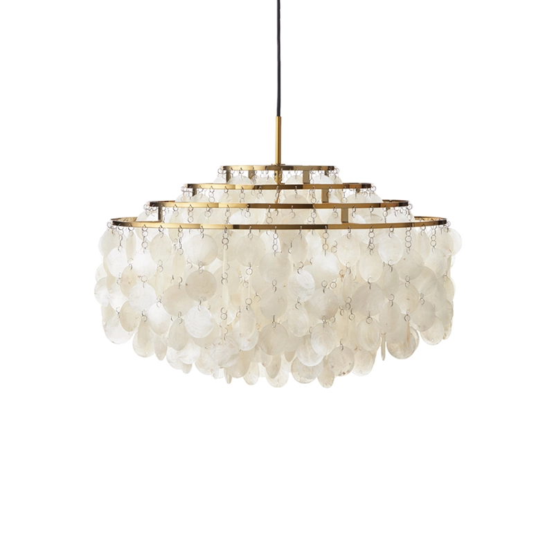 - La suspension Fun, créée en 1964, est remarquable pour son esthétique élégante et son éclat lumineux, composée de disques coquillage suspendus.