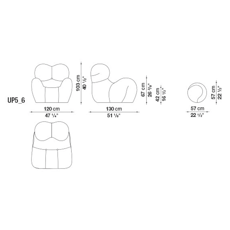 Imaginé par Gaetano Pesce, le fauteuil UP5_6 s’est imposé comme une icône du design italien, reconnue dans le monde entier. Sa configuration unique, aux caractéristiques anatomiques et aux références anthropomorphiques, évoque un refuge maternel protecteur. Cette conception est enrichie d’un élément distinctif : une sphère faisant office de pouf, reliée au fauteuil, symbolisant la dualité entre confort et captivité, avec une allusion poignante à la femme et son « boulet » au pied.