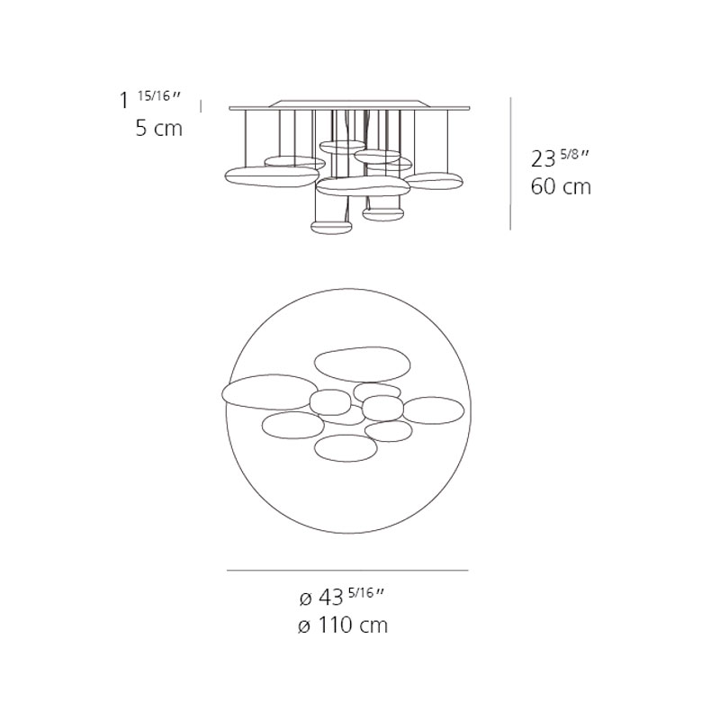 Avec Mercury Soffitto, Ross Lovegrove signe une plafonnier aussi saisissant qu’innovant, édité par Artemide. Véritable installation sculpturale, cette création contemporaine se compose d’un disque en aluminium suspendant une constellation de galets chromés aux formes organiques et fluides.