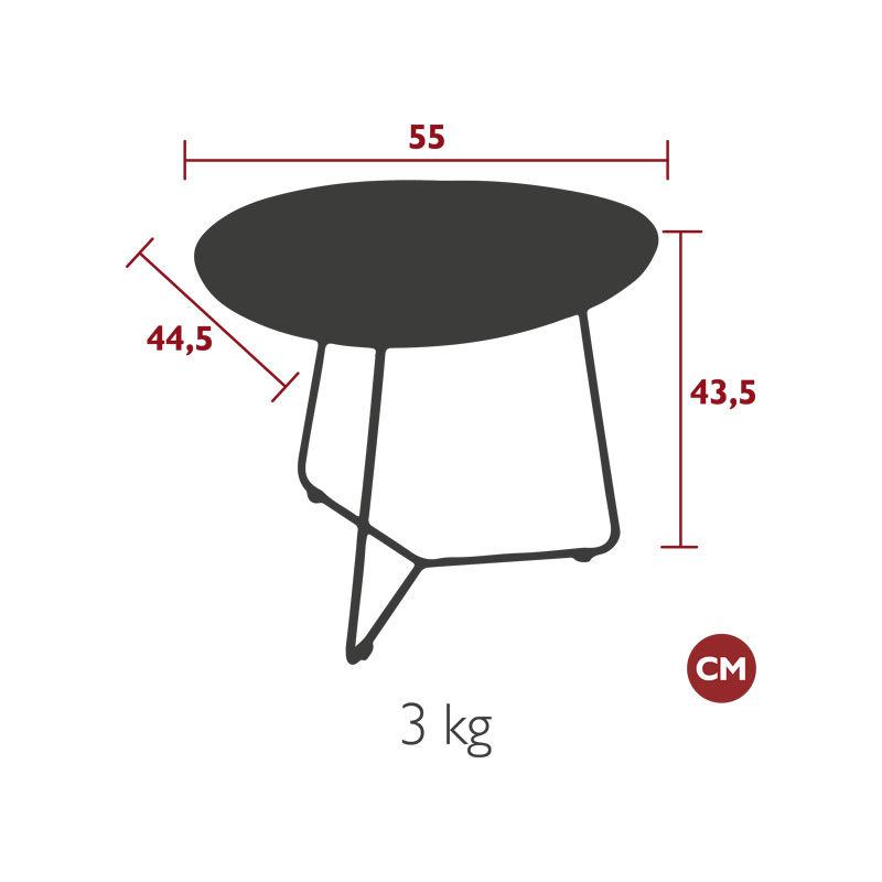 - Dimensions : H 43,5 cm – Plateau : L 55 x Larg 44,5 cm – Base : L 50 cm