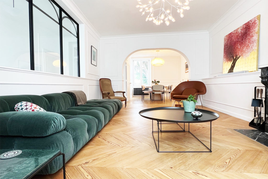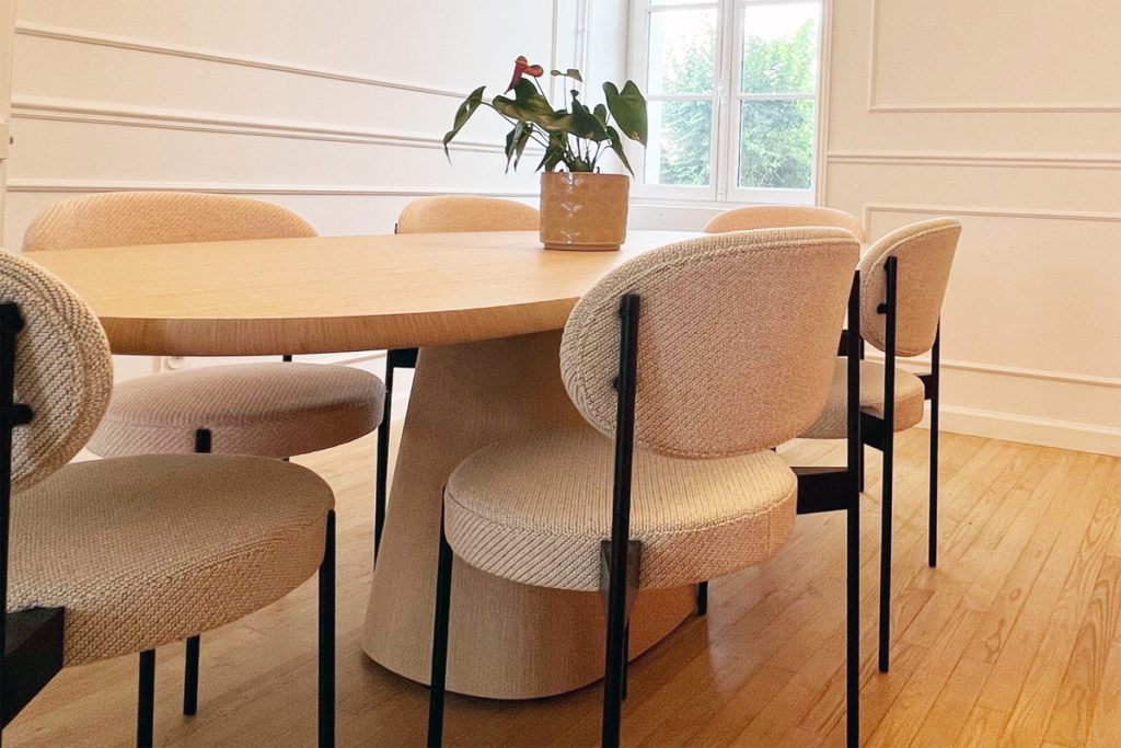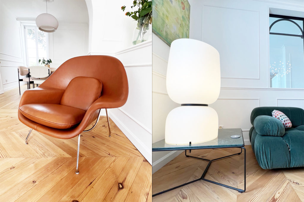 Nous avons conçu un espace où convivialité et raffinement se rencontrent, en intégrant des pièces iconiques qui subliment chaque instant de vie. Le canapé Camaleonda de B&B Italia, avec sa modularité unique, a donné une structure harmonieuse au salon tout en offrant un confort inégalé. Pour le coin repas, la table de repas Allure’O de B&B Italia, avec ses lignes élégantes et sa présence sculpturale, a parfaitement trouvé sa place, entourée des chaises de la série 430 imaginées par Verner Panton pour Verpan, qui allient confort et audace. Au-dessus de cet ensemble, la suspension Heracleum de Moooï illumine la pièce avec délicatesse et poésie, rappelant la légèreté de branches fleuries. Dans le coin lecture, le fauteuil Womb de Knoll s’est naturellement imposé, apportant une touche avant-gardiste et un confort enveloppant idéal pour les moments de détente. Enfin, les luminaires Vibia ont transformé l’espace, créant des jeux de lumière subtils qui modulent l’atmosphère et invitent à la contemplation. Ce projet incarne notre vision : imaginer des intérieurs sur mesure, empreints d’élégance et d’émotion, grâce à une sélection rigoureuse des plus belles pièces de design.