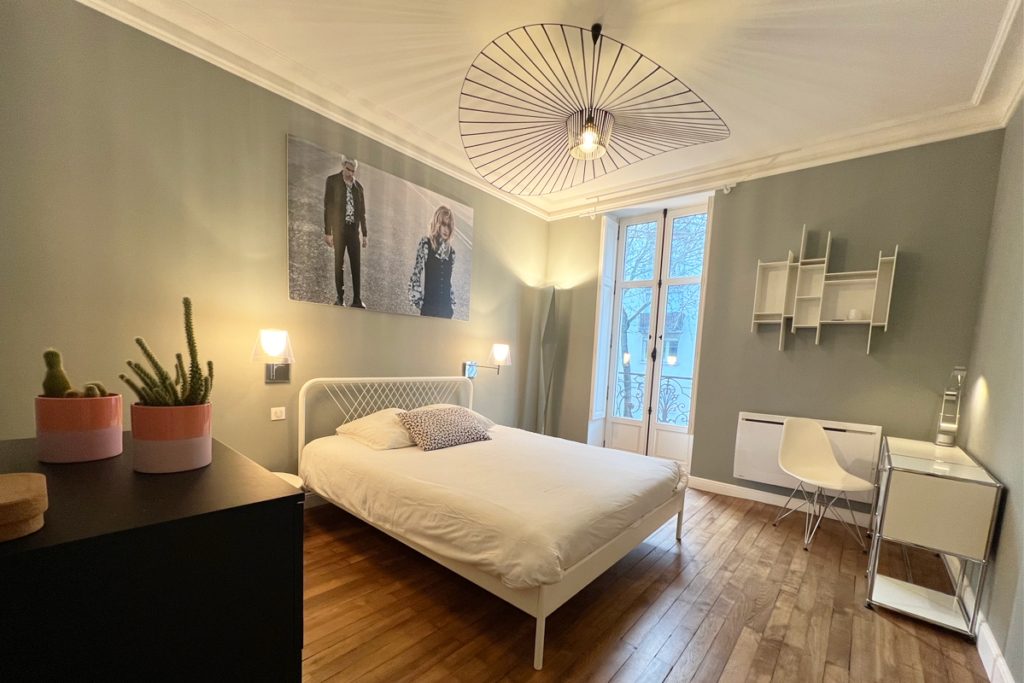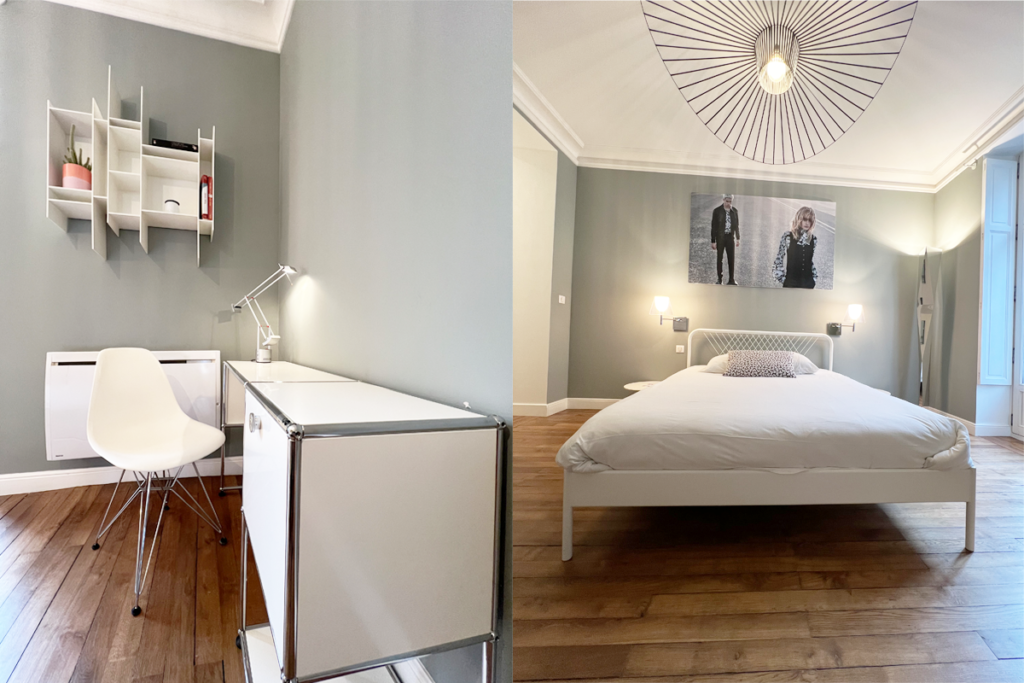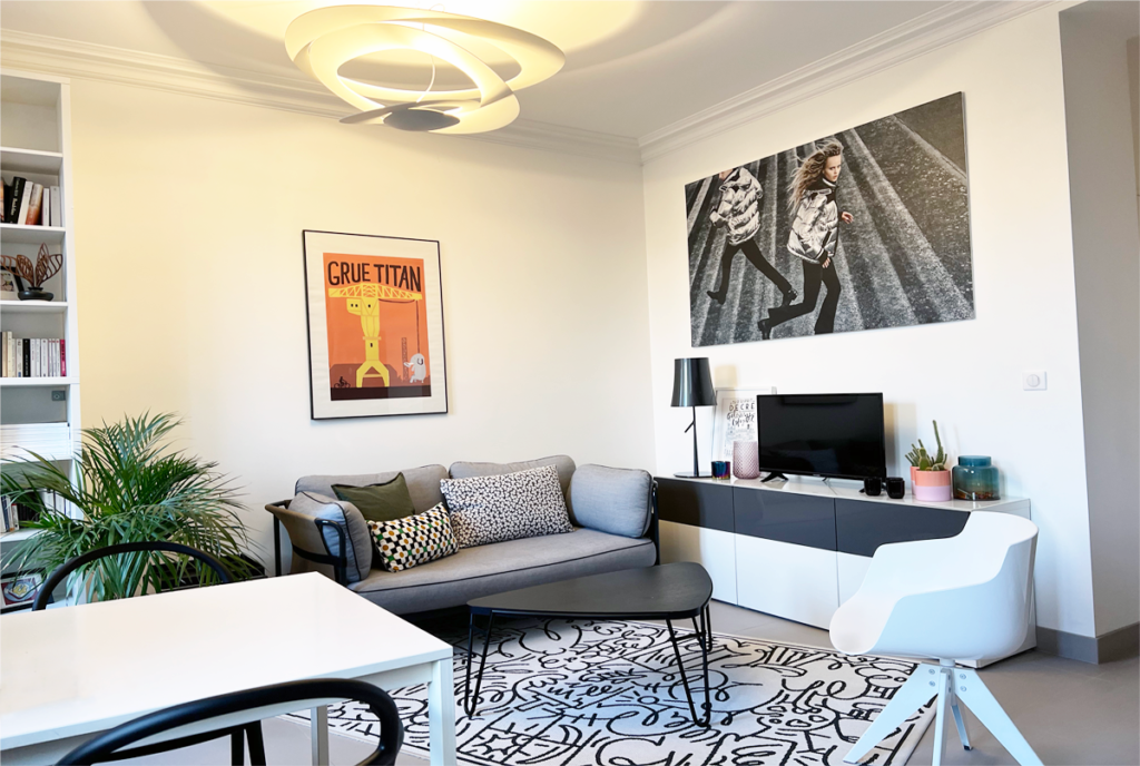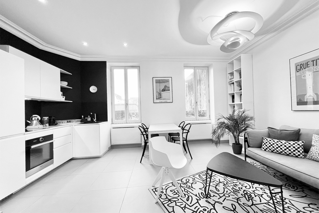 L’agencement comprend un vaste séjour, une spacieuse cuisine ouverte, une chambre avec un grand dressing et une magnifique salle de bains. Chaque espace est enrichi par une sélection éclectique d’objets de design, incluant des pièces iconiques telles que la table basse de CASSINA, le bureau de USM Haller, la suspension Vertigo de Petite Friture, et la bibliothèque de MDF Italia, apportant une touche unique à l’ensemble.